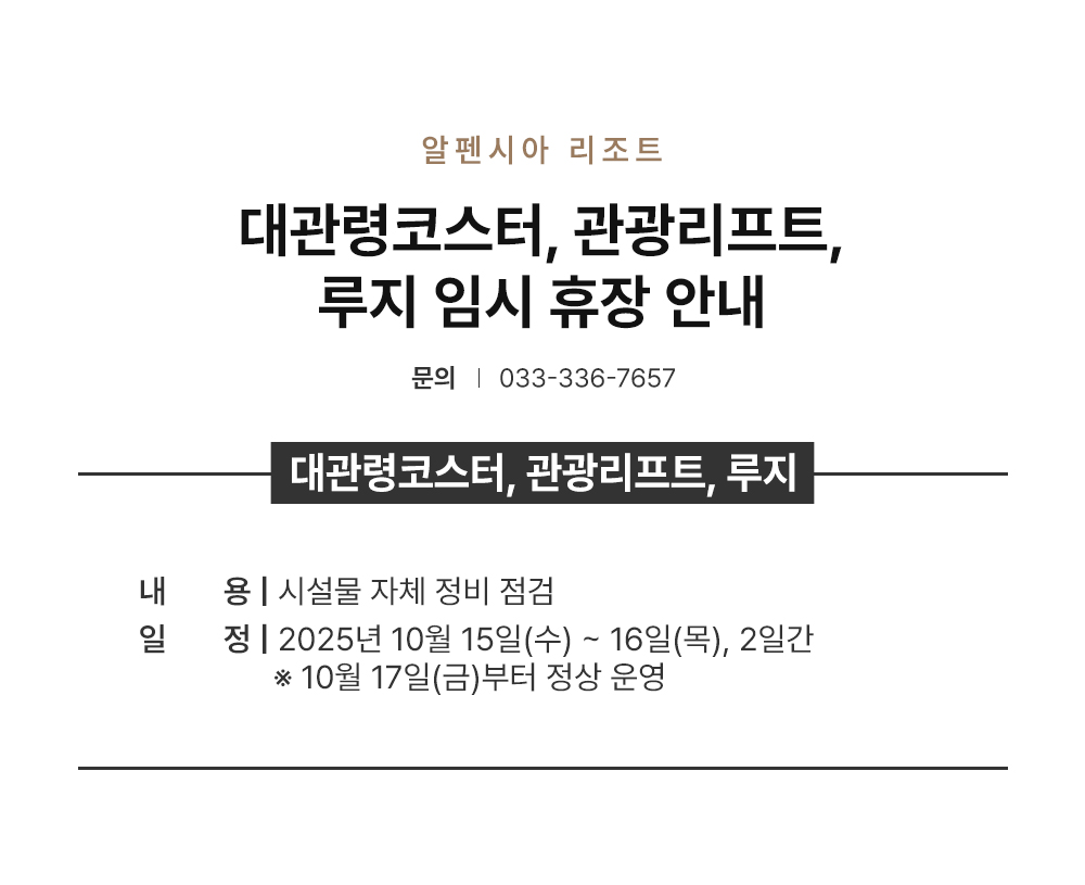 [공지] 대관령코스터, 관광리프트, 루지 임시 휴장 안내