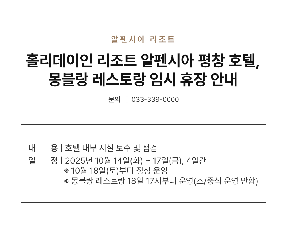[공지] 홀리데이인 리조트 알펜시아 평창 호텔, 몽블랑 레스토랑 임시 휴장 안내