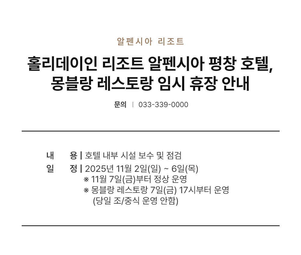 [공지] 홀리데이인 리조트 알펜시아 평창 호텔, 몽블랑 레스토랑 임시 휴장 안내